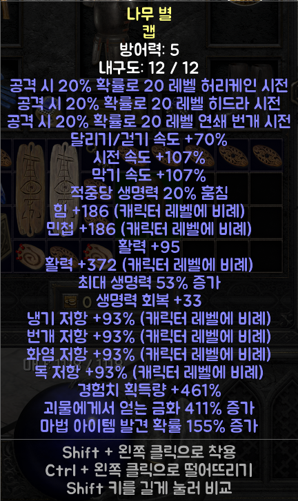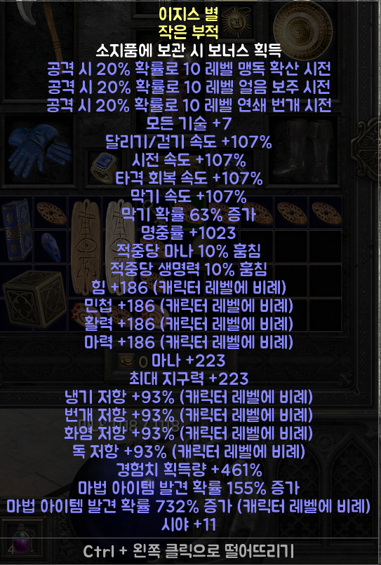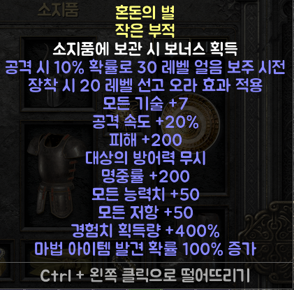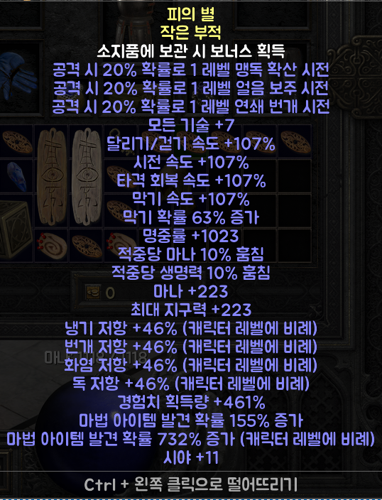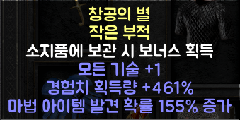 중간 난이도로 추천 드립니다. 지옥 난이도에서 적당한 파밍 작업이 필요 합니다. 위의 부적보다 옵션이 적지만 결코 무시할 수 없는 옵션이 많습니다.